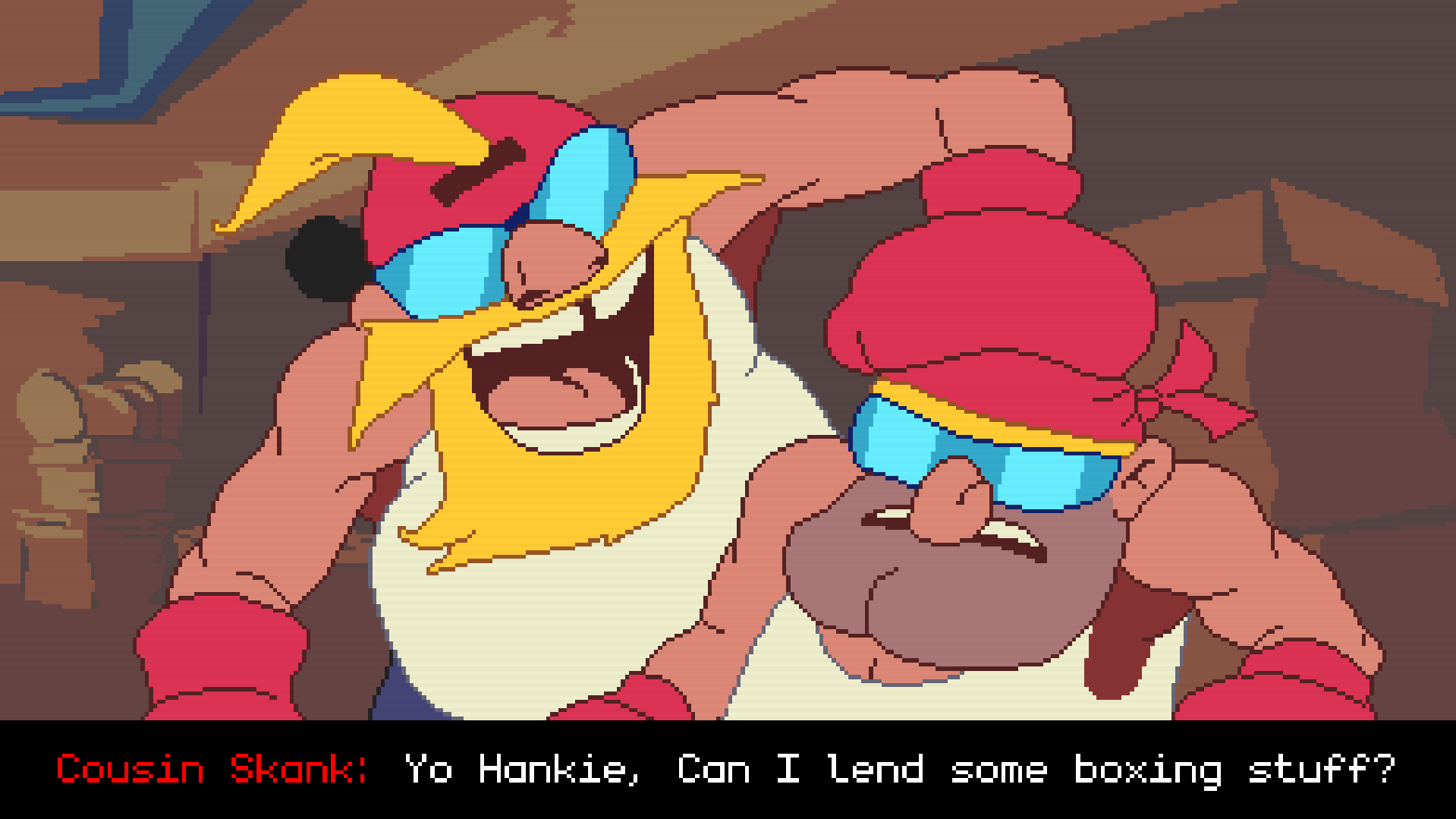 “Welcome to the Big Boy Boxing tournament, Ladies and Gentlemen. We’ve got a great show for you tonight. In the red corner is our plucky hero in the red cap. He’s trained under Coach Hank for all of two minutes and is at the top of his game with a killer Thunder jab. And in the blue corner is…three kids in a trenchcoat. Get ready for a clash for the ages!”