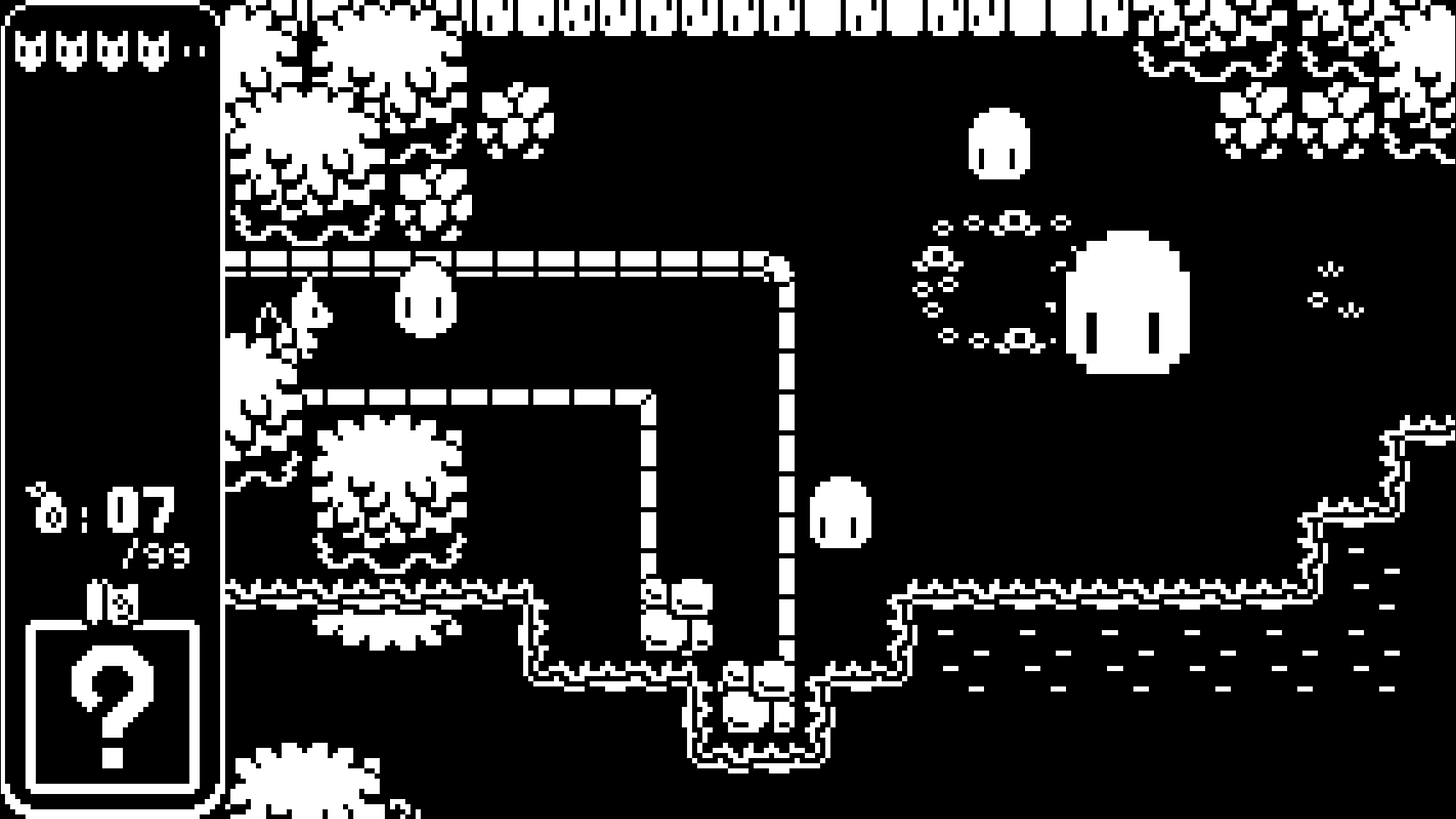 A Zelda-like where you play as a fox that’s light on the written word, Tunic is going to come up. Where that game was a full-colour isometric adventure with a lot of love for instruction booklets, Master Key is a lot simpler, with a top-down perspective, “1-bit” graphics and not even a conlang to be found on old signs, although interesting in its own right. You talk to people by approaching them and reading the text bubble filled with pictograms and emoji that pops up. Indeed, the only text outside of the title is the end of demo message.
