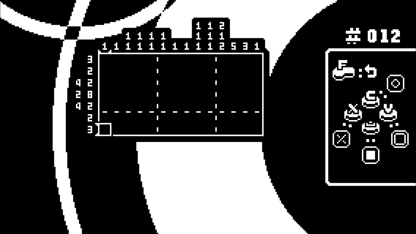 If the default Black & White is burning a hole in your retinas, you can swap at any time to a different two-tone colour palette in the options menu, with some being conjured up by the game’s Kickstarter backers. Considering the freedom you have to tweak your palette, I find it strange that the easy mode appears to be locked to one. Also in the menu is the jukebox and a robust nonogram minigame. There are 50 nonograms available to play at any point in the demo from the main menu.